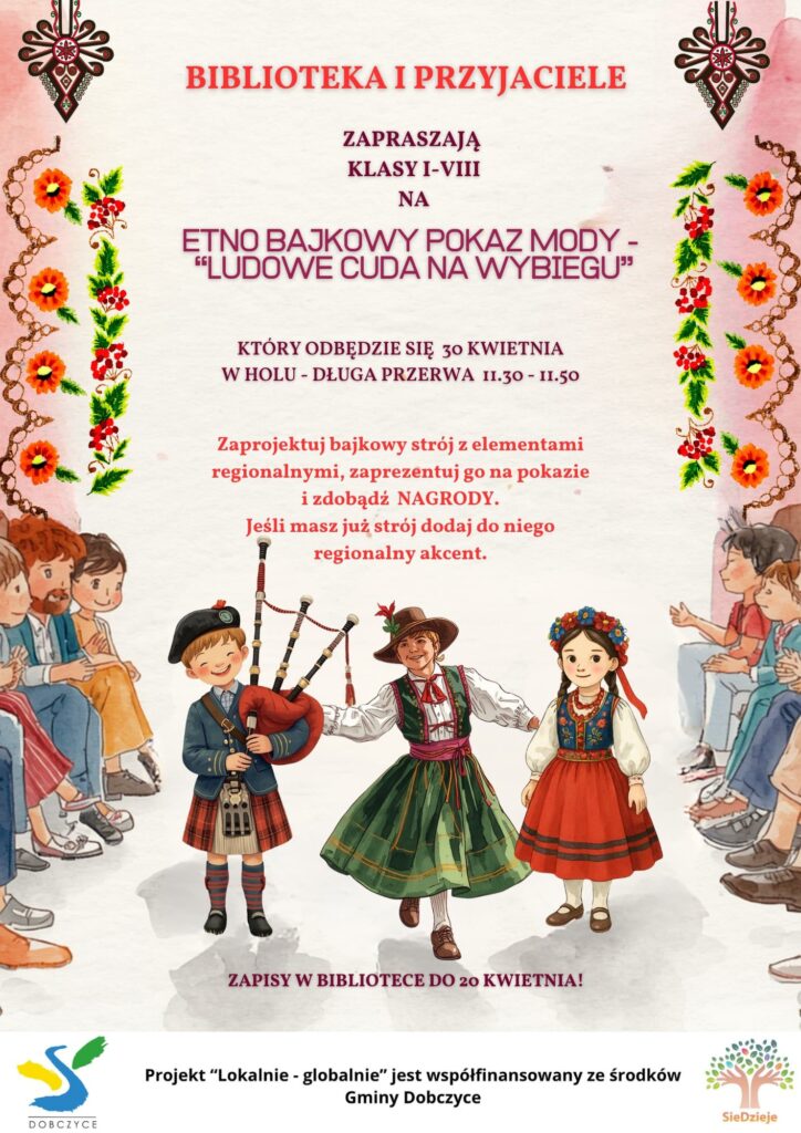 To już trzecia edycja Bajkowego Pokazu Mody, organizowanego przez bibliotekę i jej przyjaciół. Wszystkich chcących uświetnić wydarzenie zapraszamy do zapisów! Pamiętajcie o ludowym/regionalnym akcencie w swojej stylizacji!